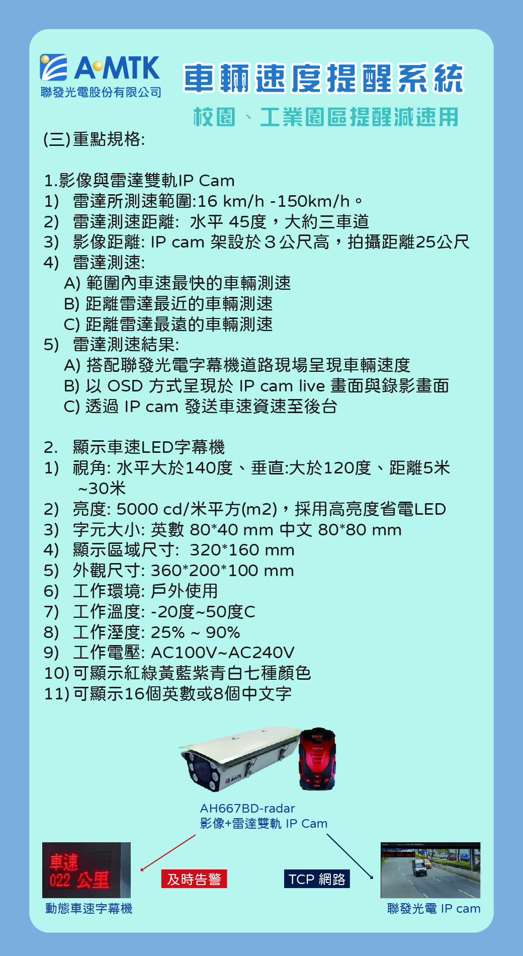 聯發光電結合影像、雷達、字幕機,推出經濟型車速提醒系統。雷達可將道路上最高時速或即時時速,呈現於現場警示字幕機上,進階還可將時速資訊疊加於聯發光電 IP cam 影像 OSD,透過網路即時送達管理平台,作為錄影紀錄、 告警管理。